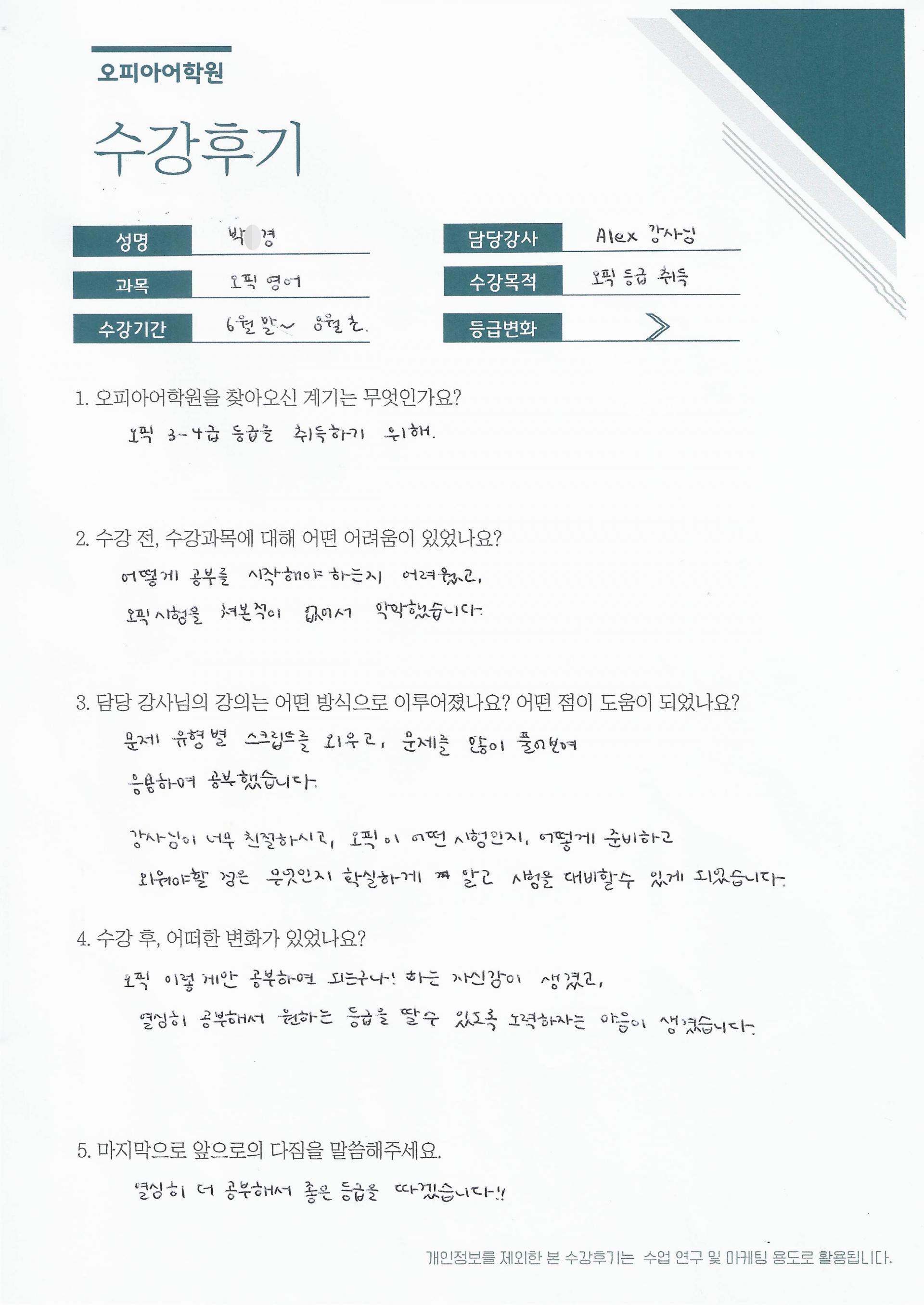 오피아어학원 동탄삼성점 #Alex 강사님께 #오픽을 수강하신 박*경님의 수강후기입니다.