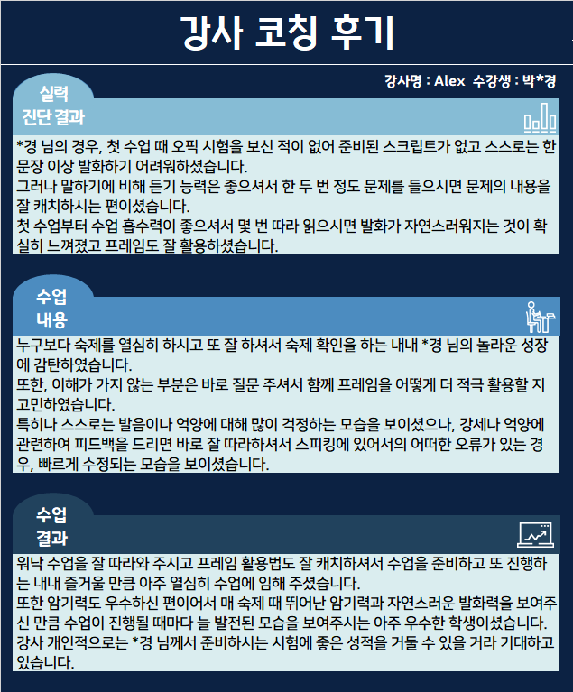 특히나 스스로는 발음이나 억양에 대해 많이 걱정하는 모습을 보이셨으나, 강세나 억양에 관련하여 피드백을 드리면 바로 잘 따라하셔서 스피킹에 있어서의 어떠한 오류가 있는 경우, 빠르게 수정되는 모습을 보이셨습니다.