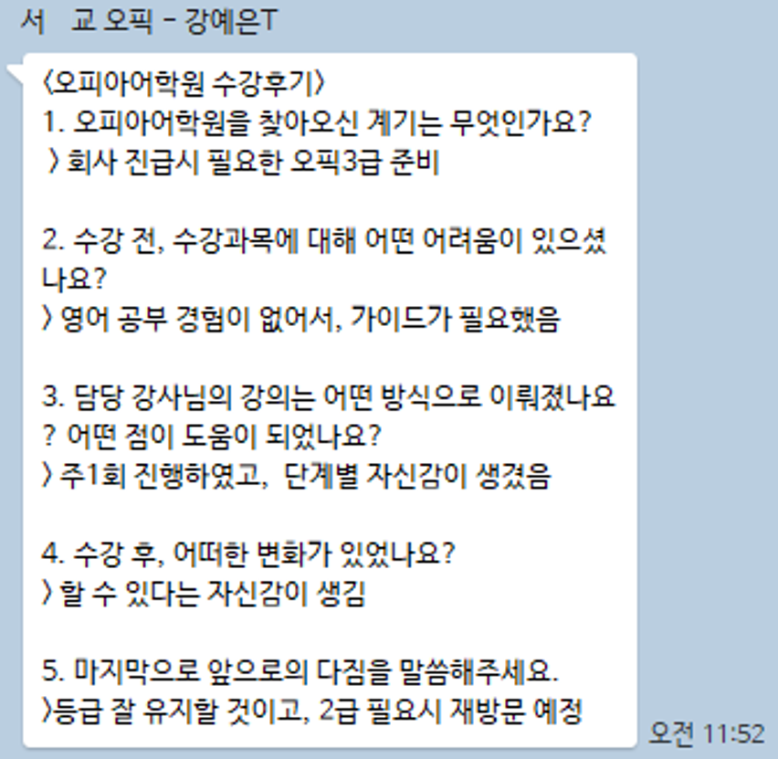 오피아어학원 수원점 #Amy Kang 강사님께 #오픽을 수강하신 서*교님의 수강후기입니다.