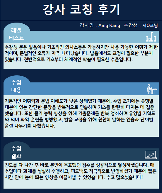 매 수업마다 과제를 성실히 수행하고, 피드백도 적극적으로 반영하셨기 때문에 짧은 시간 안에 눈에 띄는 향상을 이끌어낼 수 있었습니다.