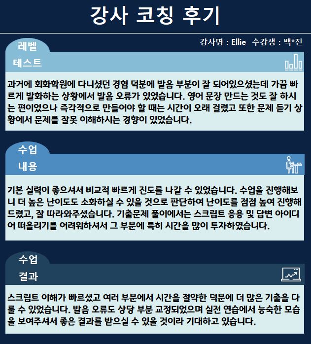 발음 오류도 상당 부분 교정되었으며 실전 연습에서 능숙한 모습을 보여주셔서 좋은 결과를 받으실 수 있을 것이라 기대하고 있습니다.