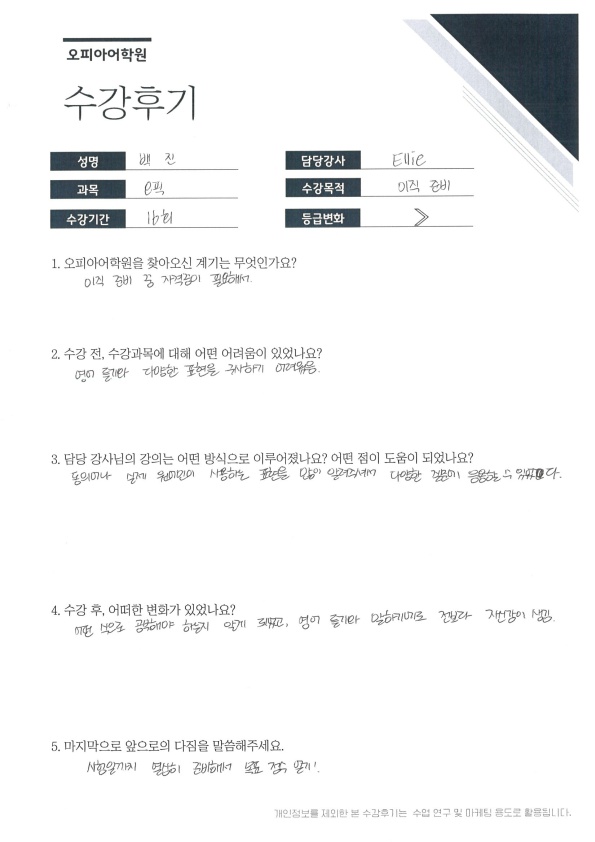 오피아어학원 수원점 #Ellie 강사님께 #오픽을 수강하신 백*진님의 수강후기입니다.