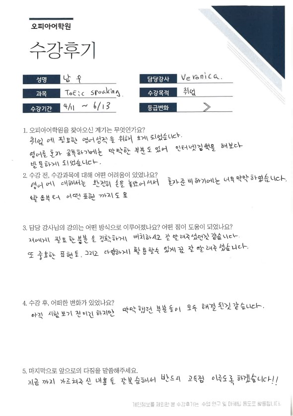 오피아어학원 분당점 #Veronica 강사님께 #토익스피킹을 수강하신 남*우님의 수강후기입니다.