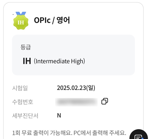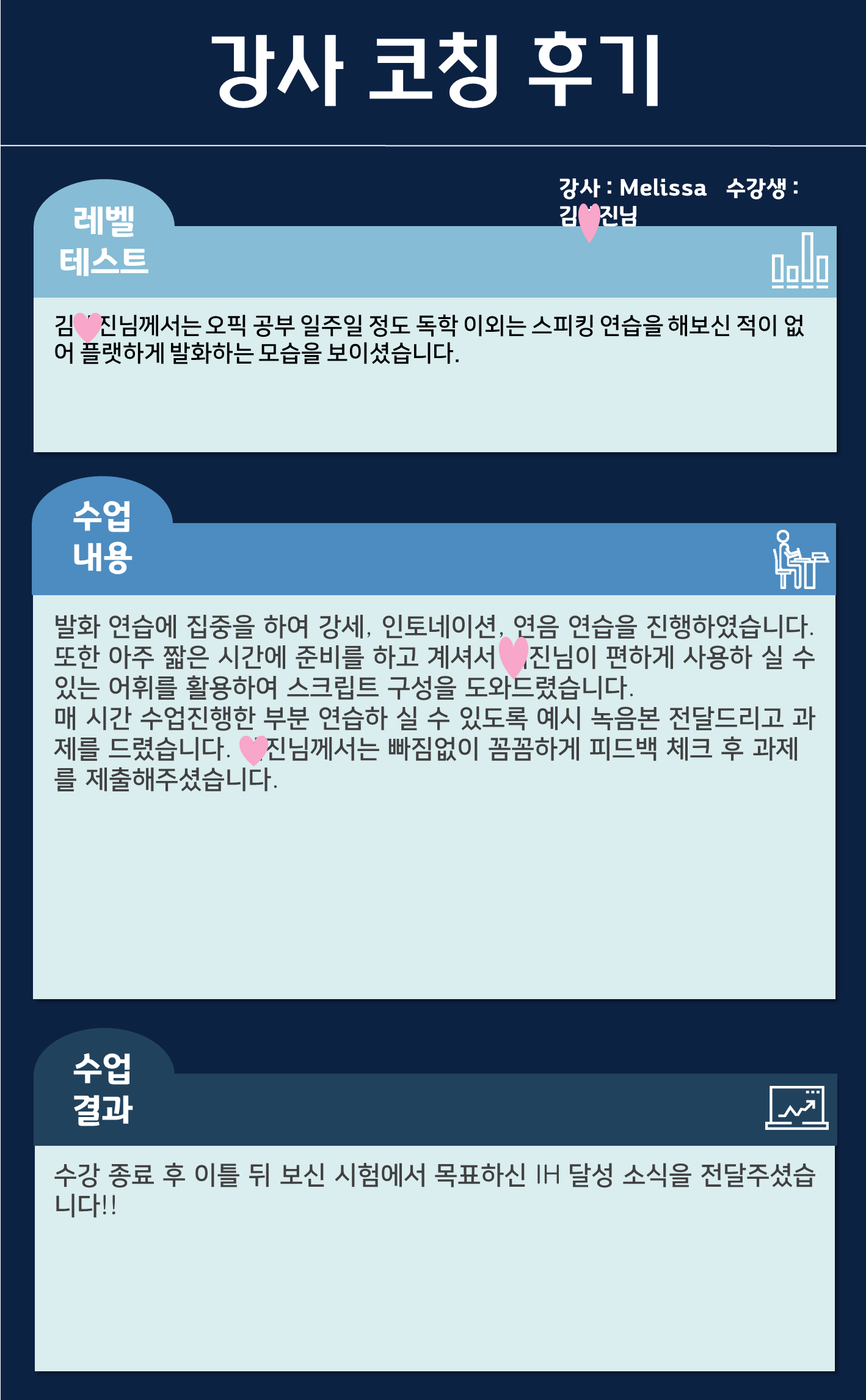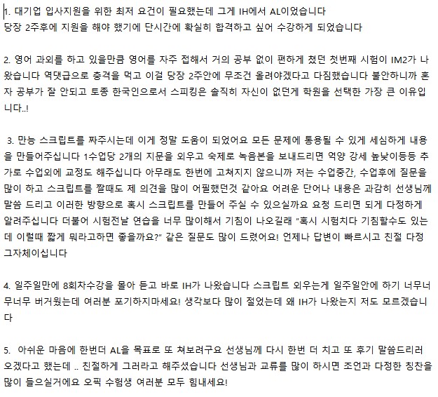 수강 종료 후 이틀 뒤 보신 시험에서 목표하신 IH 달성 소식을 전달주셨습니다!!