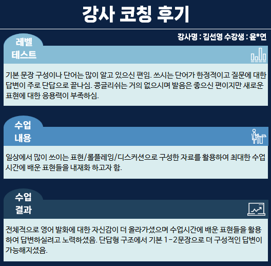 전체적으로 영어 발화에 대한 자신감이 더 올라가셨으며 수업 시간에 배운 표현들을 활용하여 답변하실려고 노력하셨습니다.