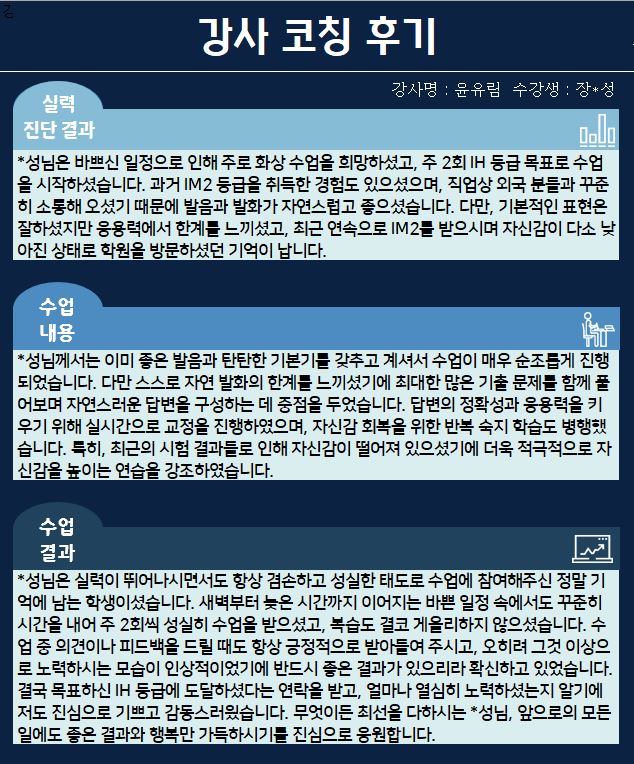 다만, 기본적인 표현은 잘하셨지만 응용력에서 한계를 느끼셨고, 최근 연속으로 IM2를 받으시며 자신감이 다소 낮아진 상태로 학원을 방문하셨던 기억이 납니다.