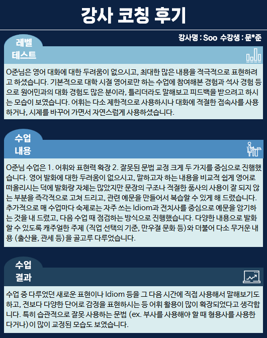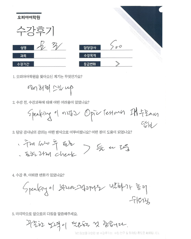 오피아어학원 분당점 #Soo강사님께 #영어회화를 수강하신 문*준님의 수강후기입니다.