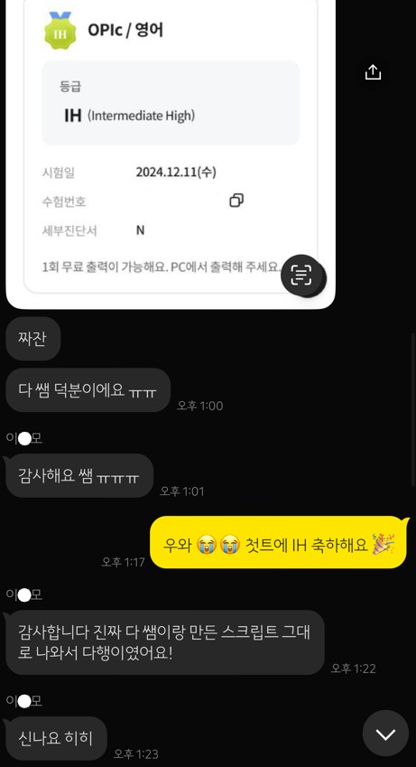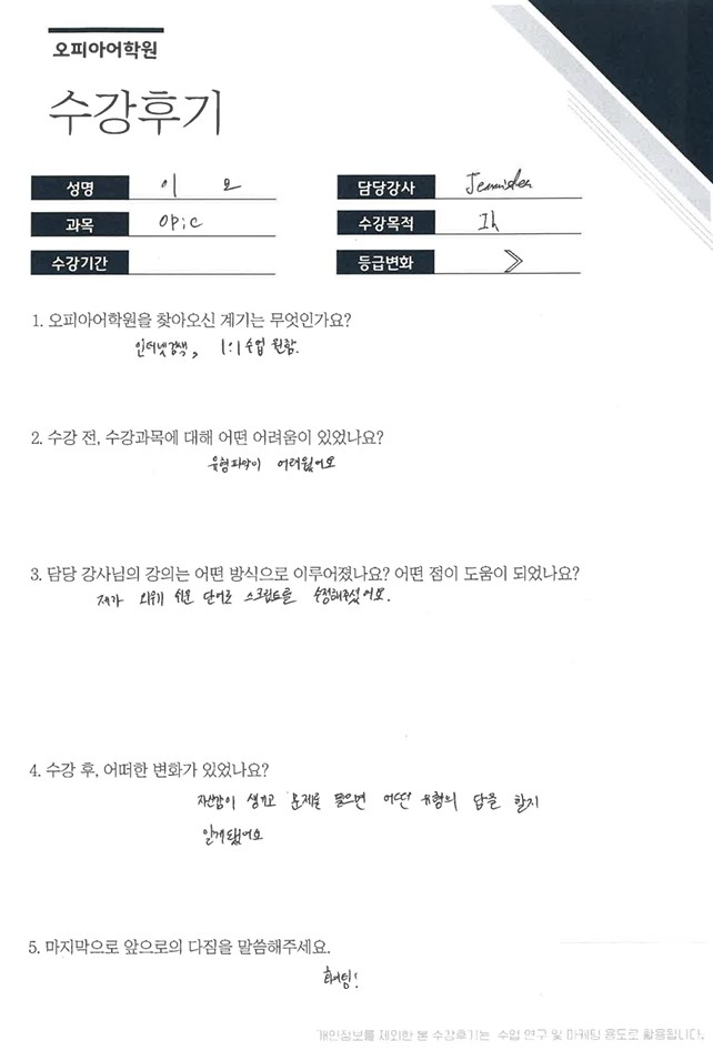 오피아어학원 분당점 #Jennifer 강사님께 #오픽을 수강하신 이*모님의 수강후기입니다.