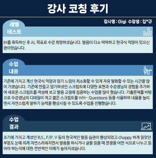 기존에 가지고 계신 한국식 억양과 암기 느낌이 최소화할 수 있게 자유 발화할 수 있는 시간을 많이 가졌습니다.