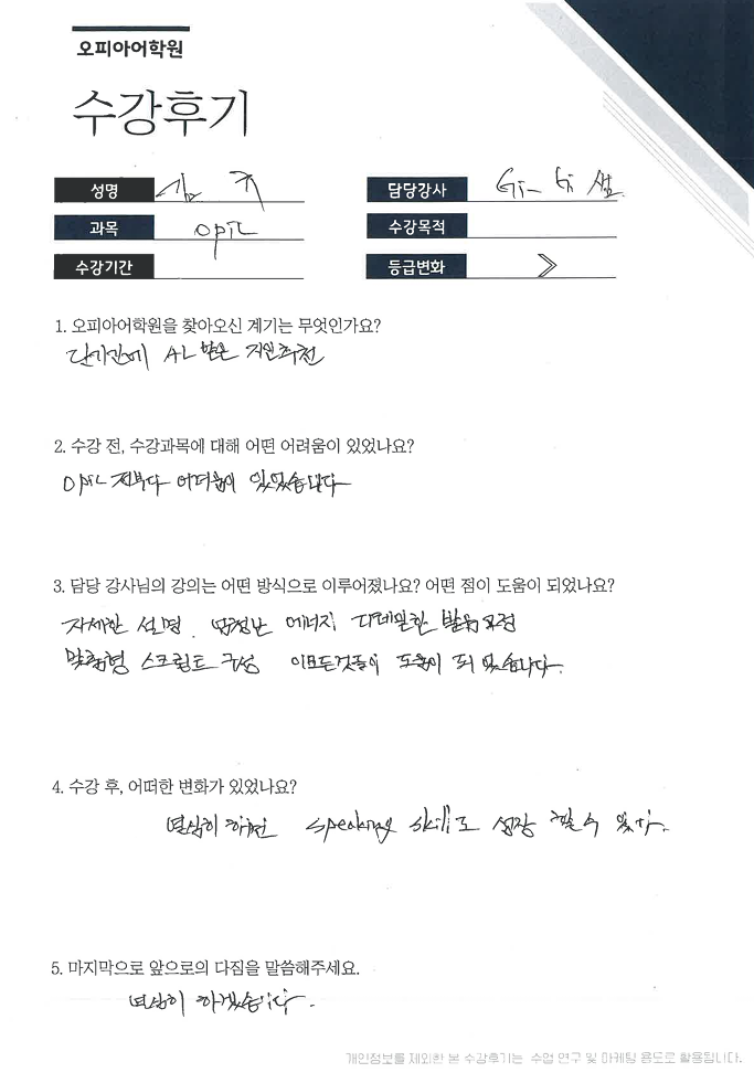 오피아어학원 분당점 #Gigi 강사님께 #오픽을 수강하신 김*규님의 수강후기입니다.