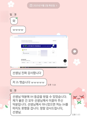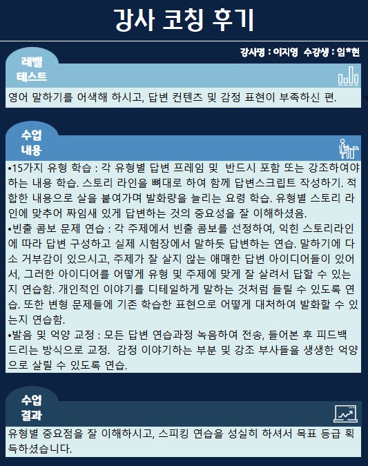 유형별 중요점을 잘 이해하시고, 스피킹 연습을 성실히 하셔서 목표 등급 획득하셨습니다.