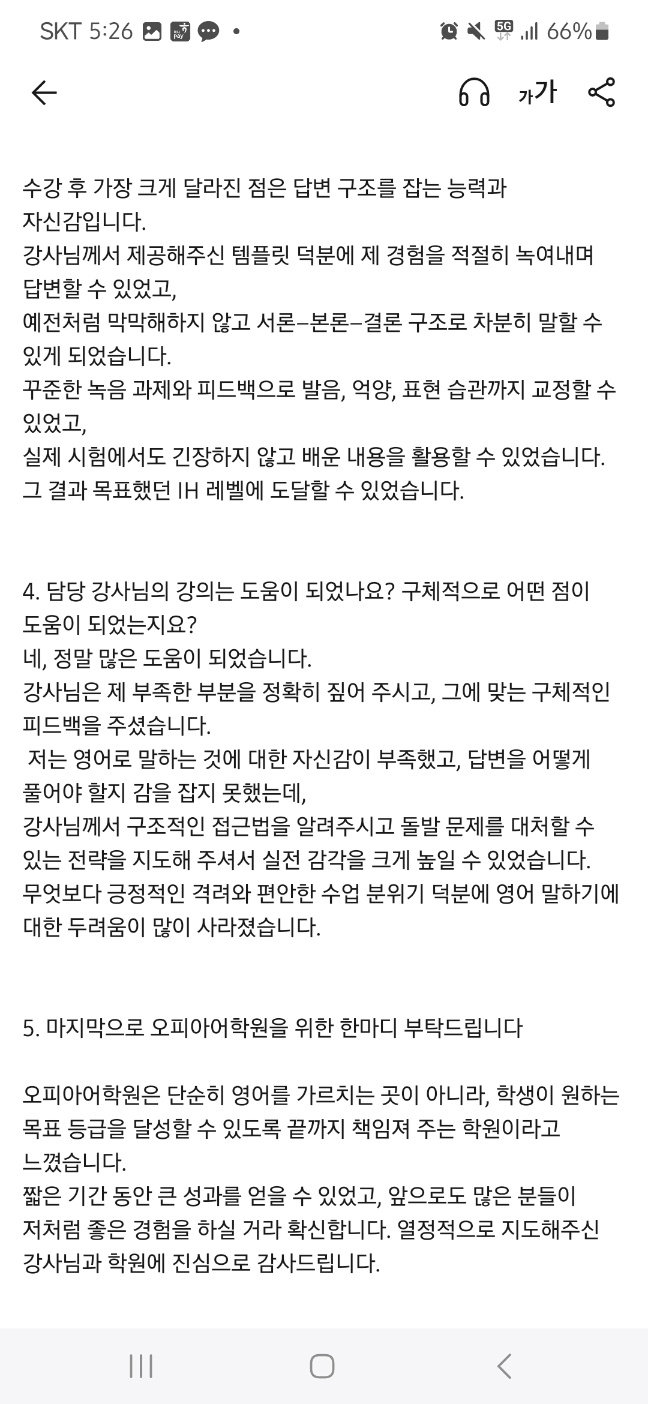 그래서 1대1 맞춤형 수업과 전문적인 커리큘럼, 그리고 개별 피드백을 받을 수 있는 곳을 찾다가 오피아어학원을 알게 되었습니다.