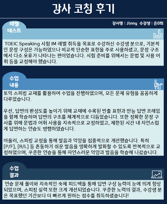 연습 문제 풀이와 지속적인 숙제 피드백을 통해 답변 구성 능력이 눈에 띄게 향상되었으며, 스피킹 실력 또한 크게 개선되었습니다.