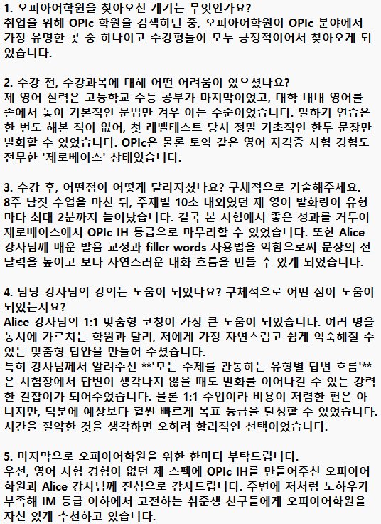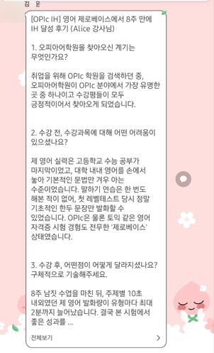 오피아어학원 강남점 #이지영 Alice 강사님께 #오픽을 수강하신 김*운님의 수강후기입니다.