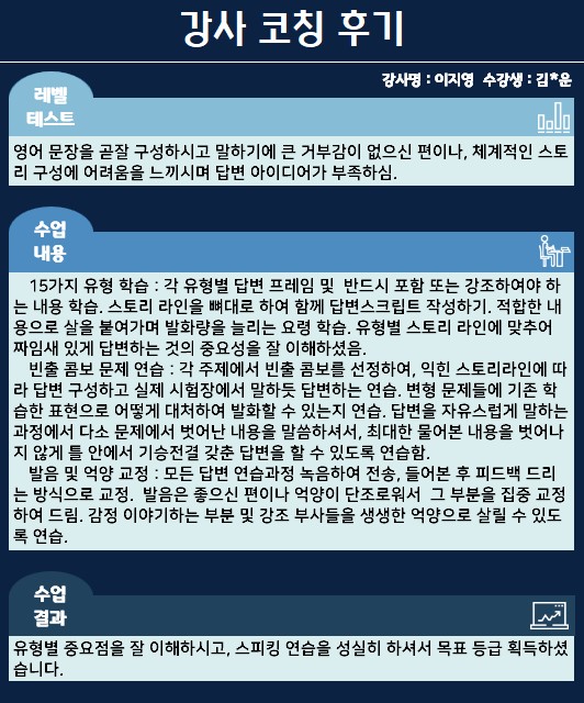 유형별 중요점을 잘 이해하시고, 스피킹 연습을 성실히 하셔서 목표 등급 획득하셨습니다.
