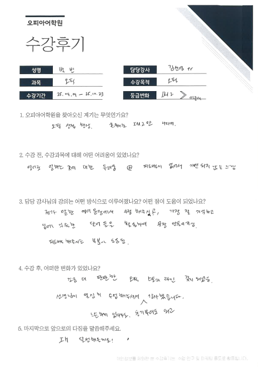 오피아어학원 분당점 #김선영 강사님께 #오픽을 수강하신 박*빈님의 수강후기입니다.