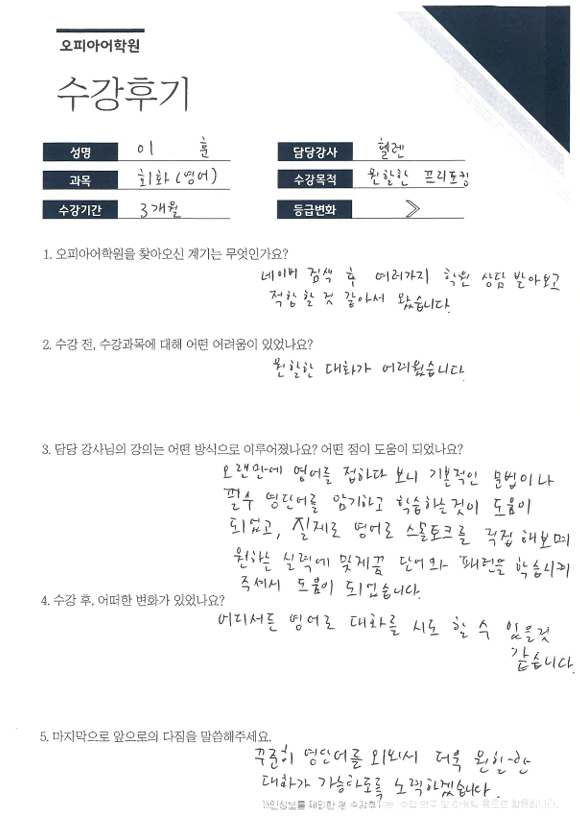 오피아어학원 분당점 #Helen 강사님께 #영어회화를 수강하신 이*훈님의 수강후기입니다.