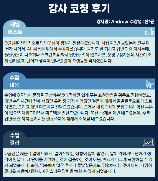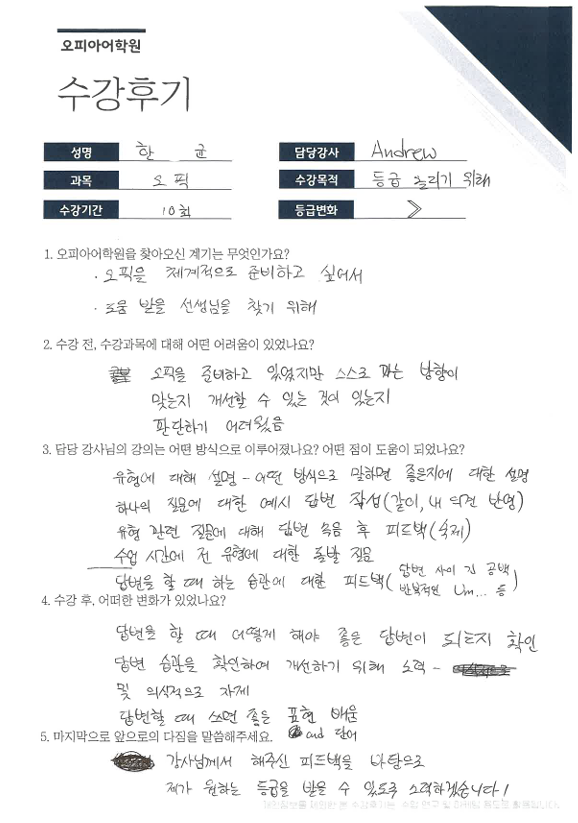 오피아어학원 분당점 #Andrew 강사님께 #오픽을 수강하신 한*균님의 수강후기입니다.
