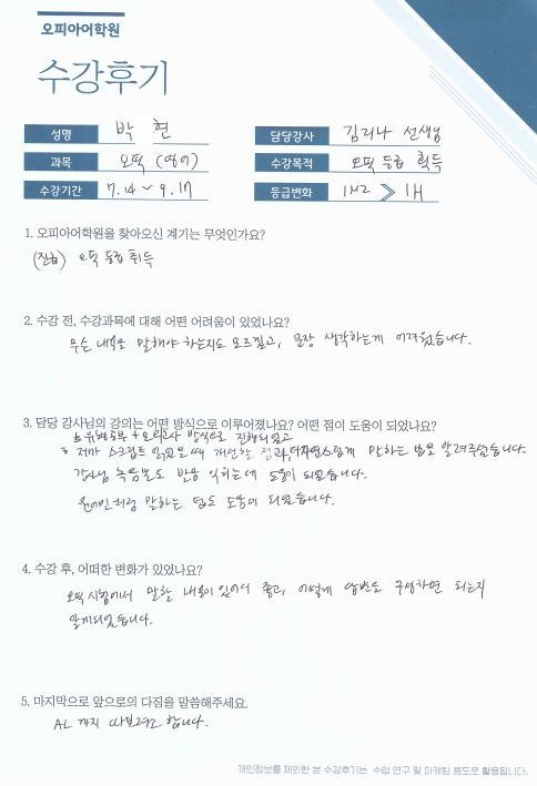 오피아어학원 동탄삼성점 #김리나 강사님께 #오픽을 수강하신 박*현님의 수강후기입니다.