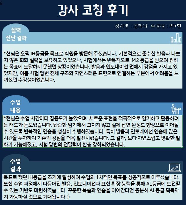*현님은 수업 시간마다 집중도가 높았으며, 새로운 표현을 적극적으로 암기하고 활용하려는 태도가 돋보였습니다.