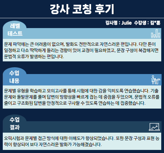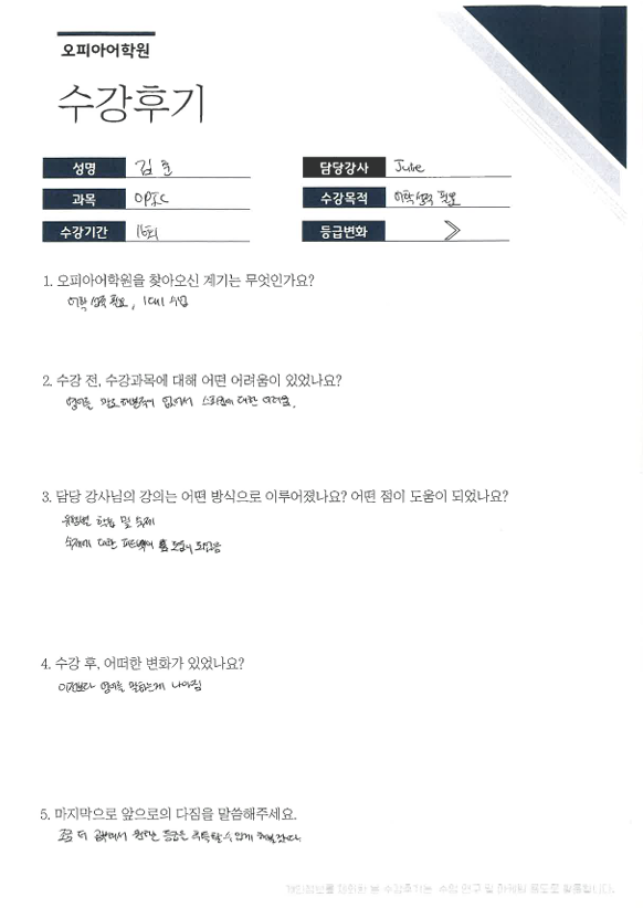 오피아어학원 분점 #Julie 강사님께 #오픽을 수강하신 김*훈님의 수강후기입니다.