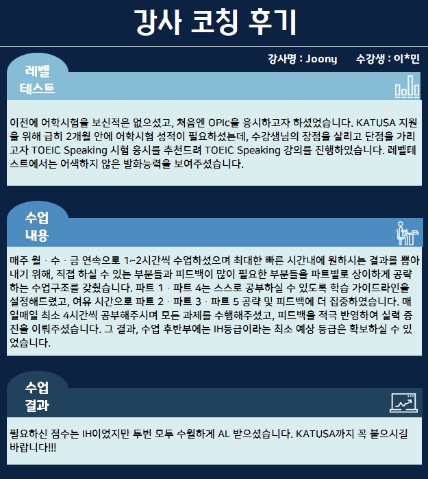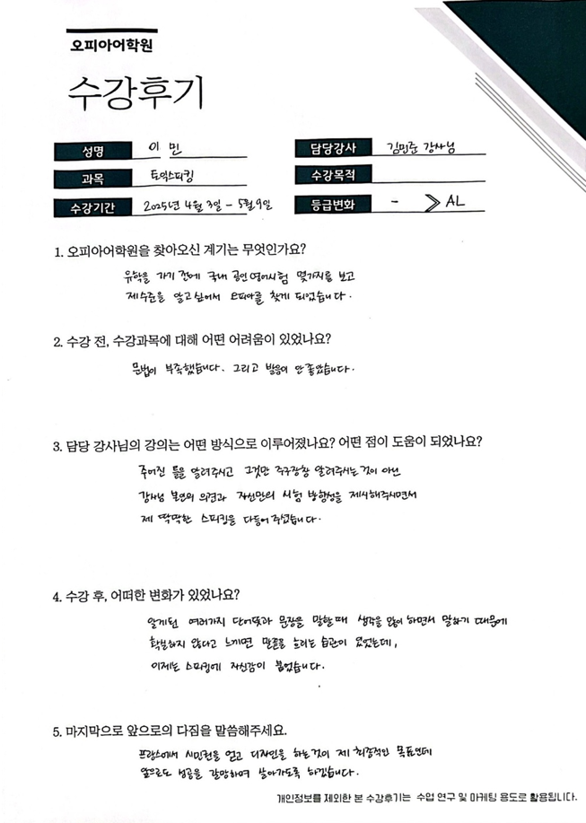 오피아어학원 인천송도점 #Joony 강사님께 #I토익스피킹 수강하신 이*민님의 수강후기입니다.