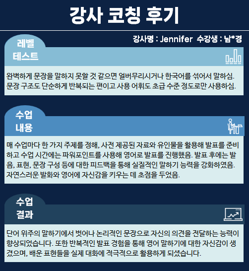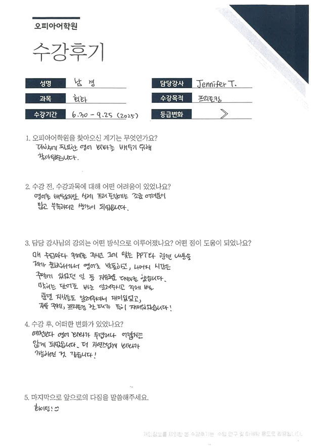오피아어학원 분당점 #Jennifer 강사님께 #영어회화를 수강하신 남*경님의 수강후기입니다.
