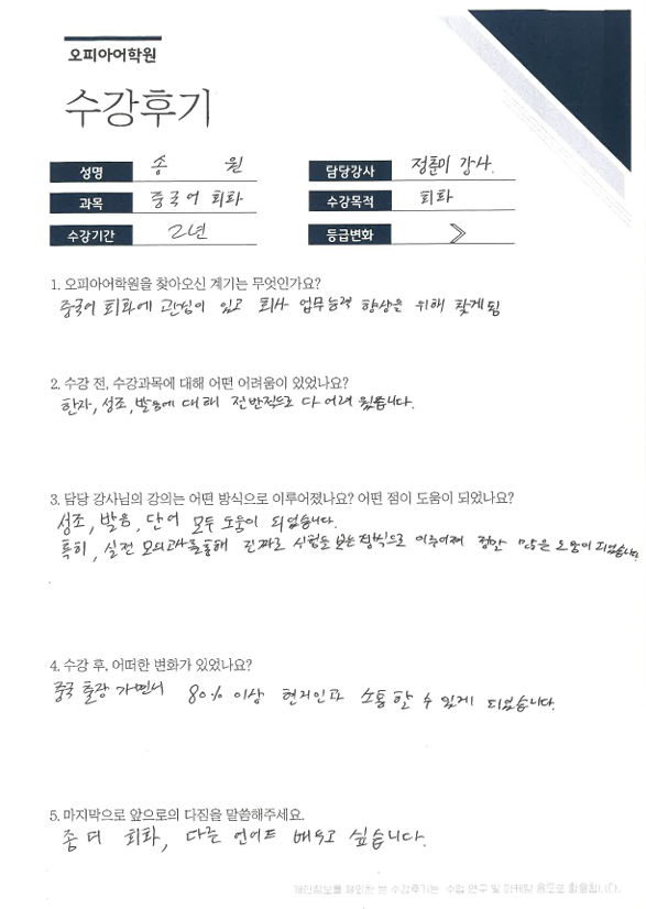 오피아어학원 분당점 #정춘미 강사님께 #중국어회화를 수강하신 송*원님의 수강후기입니다.