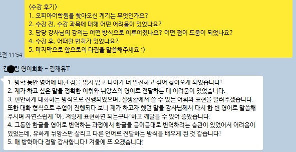 "수업의 첫 20분 정도는 일상적인 이야기를 나누며 많은 발화 기회를 드리고,