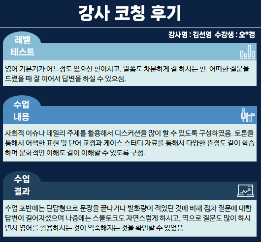 역으로 질문도 많이 하시면서 영어를 활용하시는 것이 익숙해지는 것을 확인할 수 있었습니다.