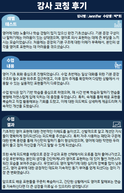 영어에 대한 막연한 두려움이 줄고 점차 자신감을 가지고 말할 수 있게 되셨습니다.