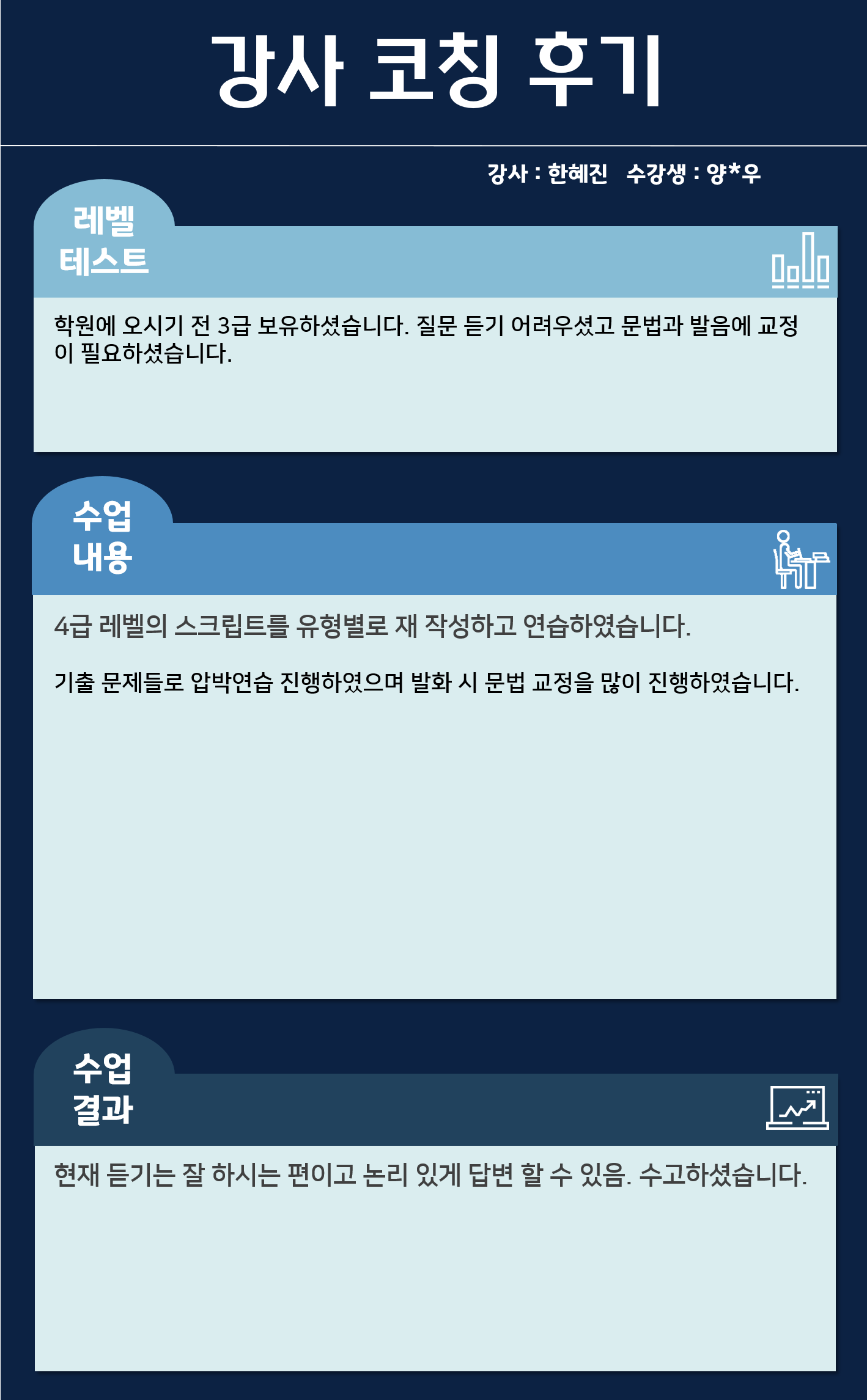 학원에 오시기 전 3급 보유하셨습니다. 질문 듣기 어려우셨고 문법과 발음에 교정이 필요하셨습니다.