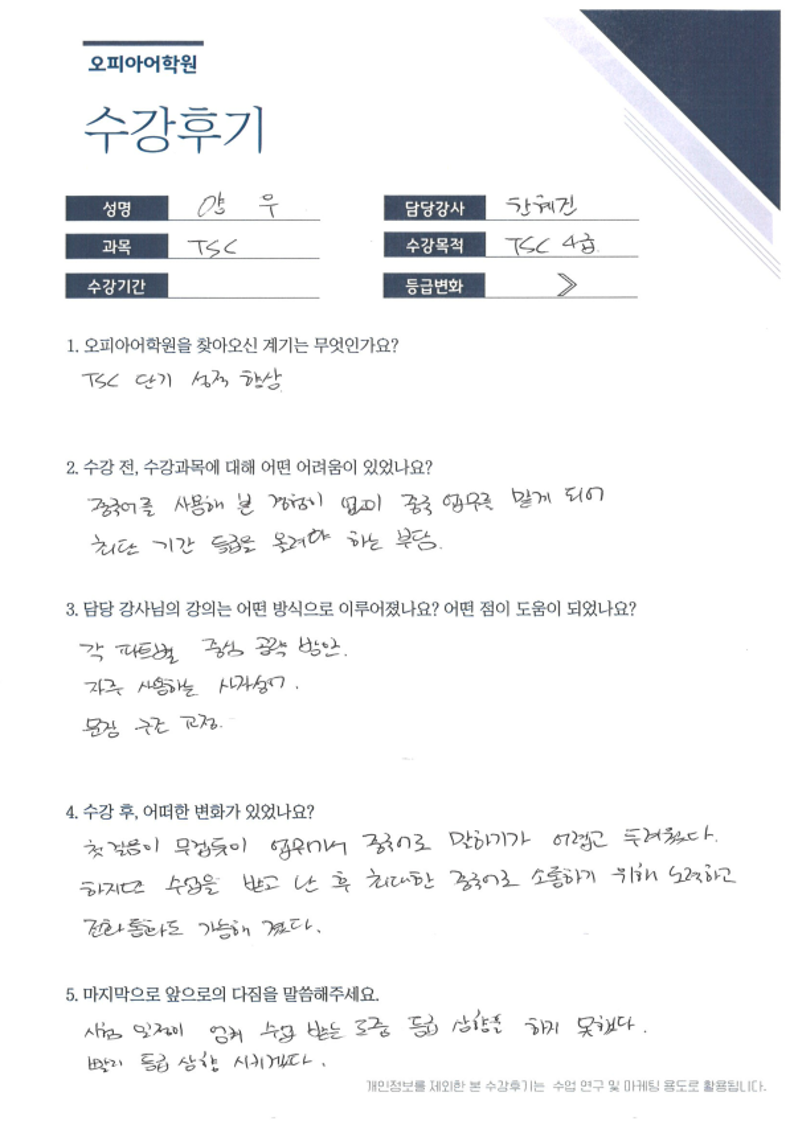 오피아어학원 수원점 #한혜진 강사님께 #TSC를 수강하신 양*우님의 수강후기입니다.
