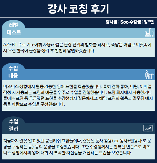 또한 수강생께서는 반복된 연습으로 비즈니스 상황에서의 영어 대화 시 부족한 자신감을 개선하는 모습을 보였습니다.