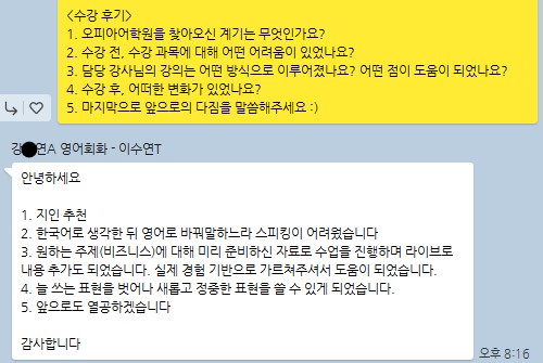 오피아어학원 분당점 #Soo 강사님께 #영어회화를 수강하신 강*연님의 수강후기입니다.