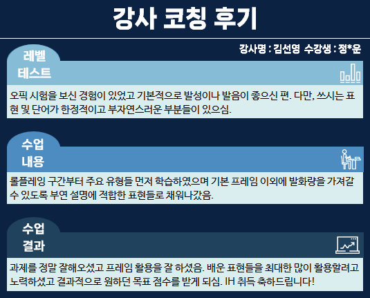 배운 표현들을 최대한 많이 활용할려고 노력하셨고 결과적으로 원하던 목표 점수를 받게 되셨습니다.