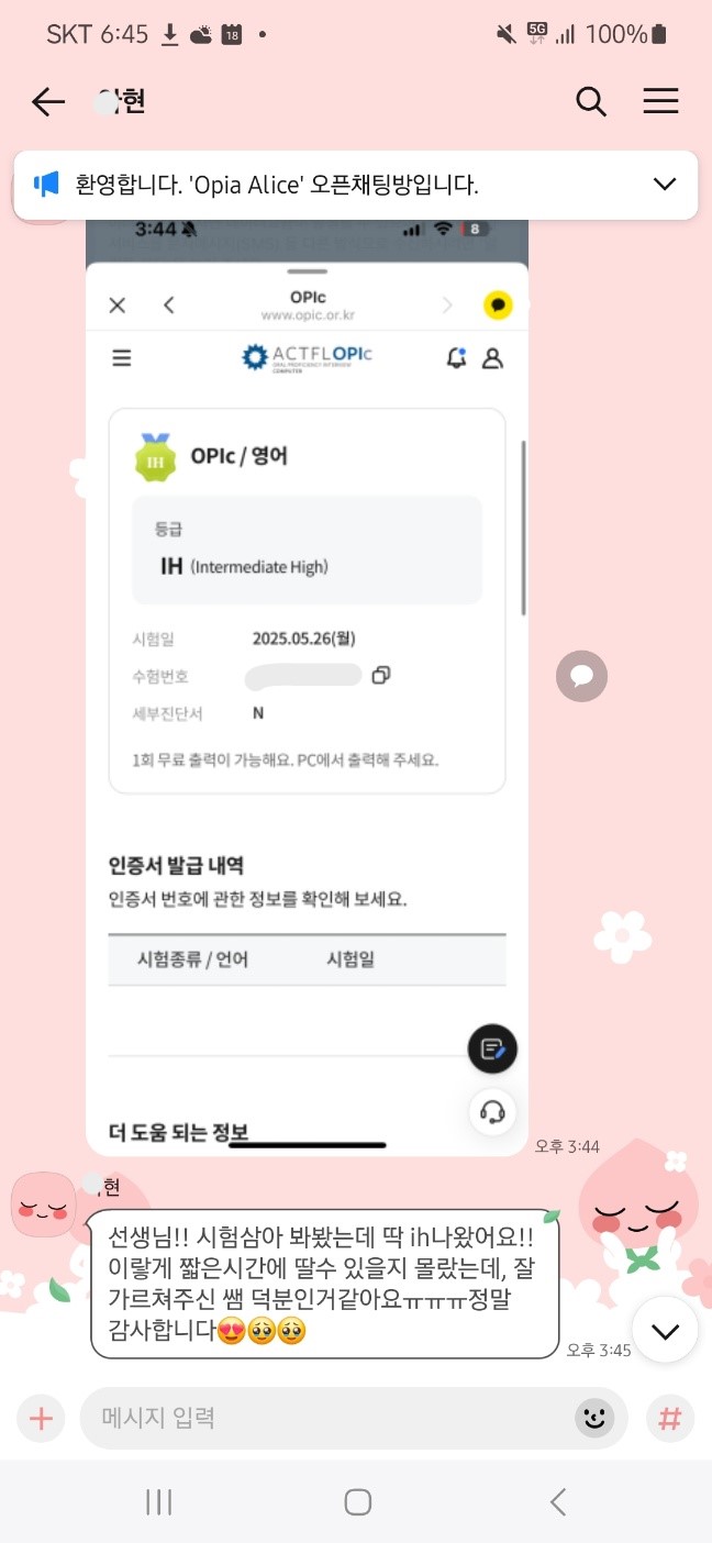 오피아어학원 강남점 #Alice 강사님께 #오픽을 수강하신 김*현님의 수강후기입니다.