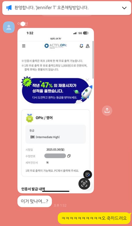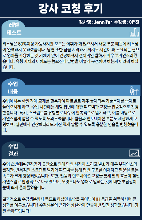 결과적으로 수강생분께서 목표로 하셨던 IM2를 뛰어넘어 IH 등급을 획득하시며 큰 성과를 이루셨습니다!