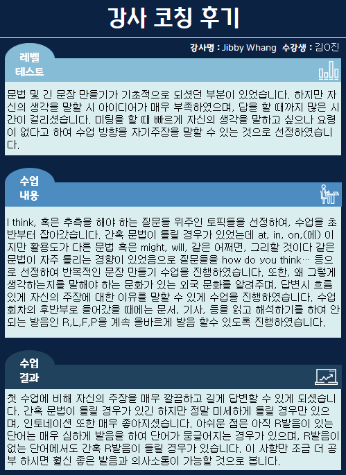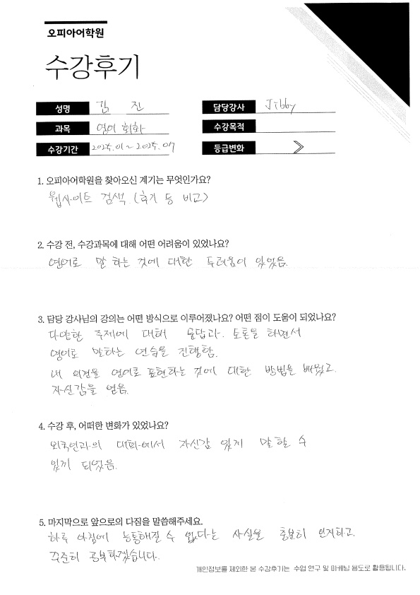 오피아어학원 수원점 #Jibby 강사님께 #영어회화를 수강하신 김*진님의 수강후기입니다.