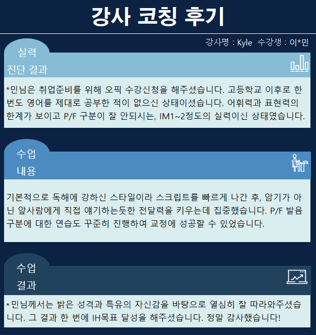 *민님께서는 밝은 성격과 특유의 자신감을 바탕으로 열심히 잘 따라와주셨습니다.
